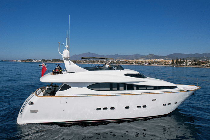 Malex is a Maiora 26DP, made in Italy, it has a raised pilot house with retractable bathing platform which allows the hull to be similar in volume to that of a 30 metre yacht.